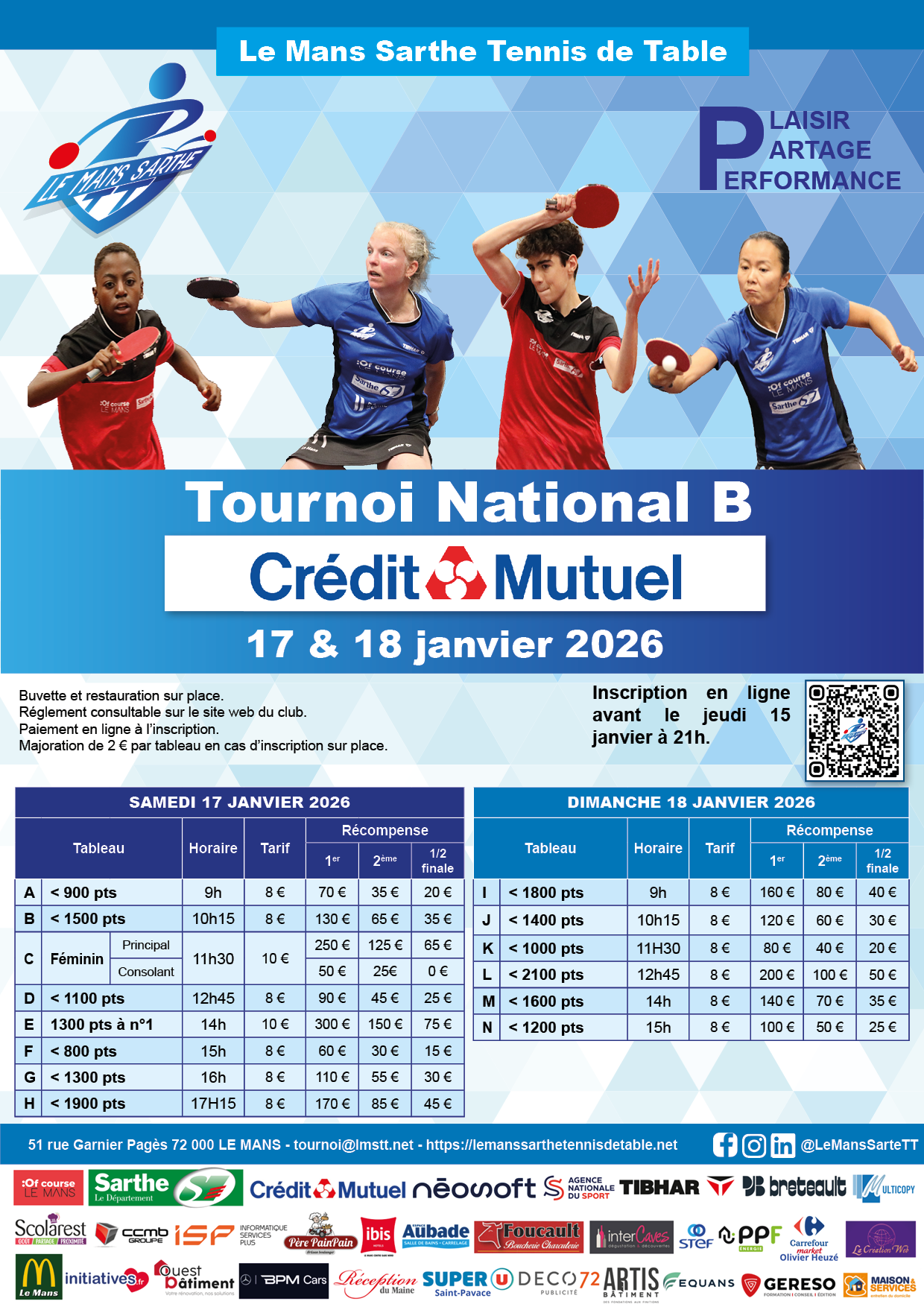 Le Mans Sarthe Tennis de Table organise son 3ème tournoi National B en partenariat avec le Crédit Mutuel, le Samedi 17 Janvier et Dimanche 18 Janvier 2026.